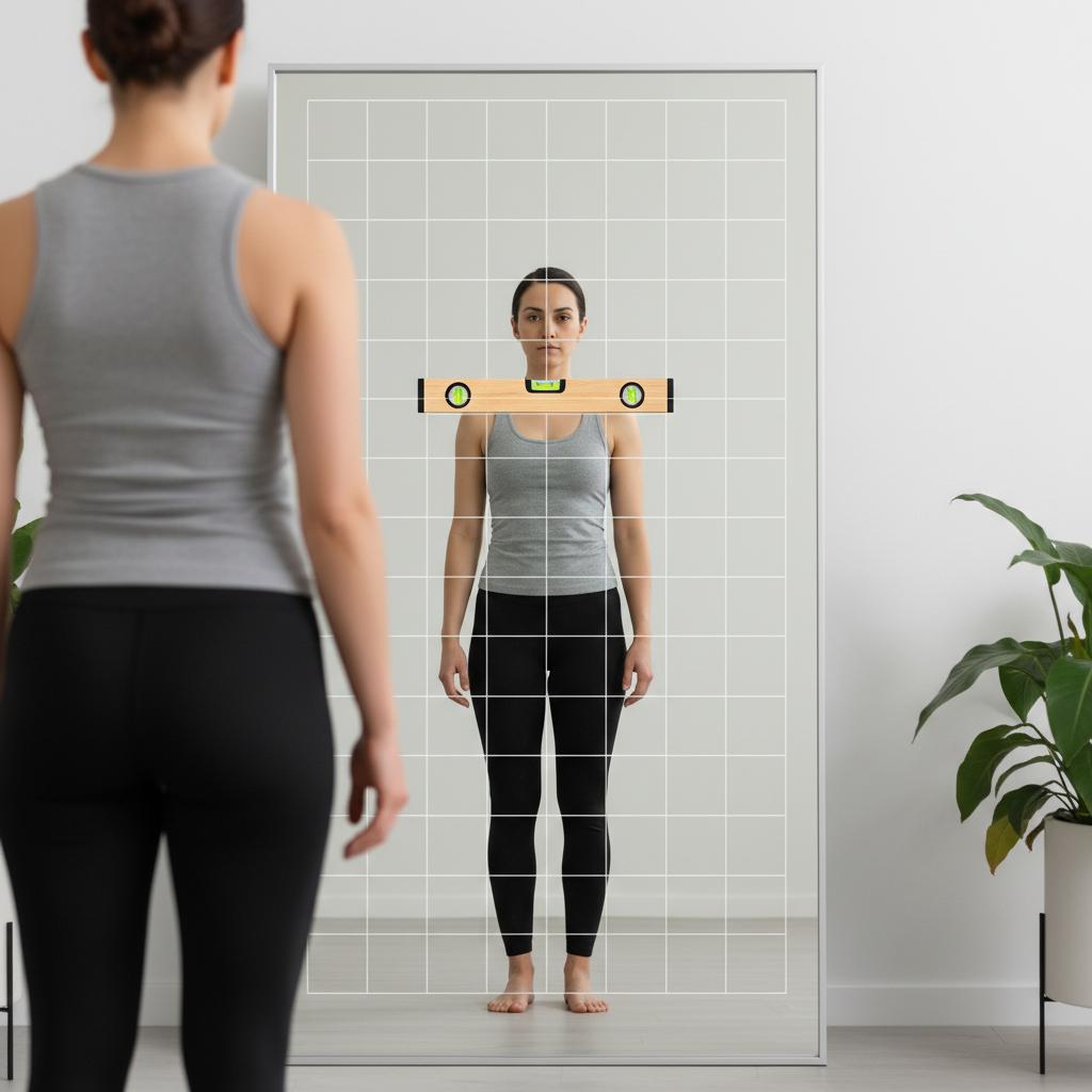 - Test linii: Stań bokiem do lustra – linia od ucha przez bark, biodro, kolano do kostki powinna być prosta.